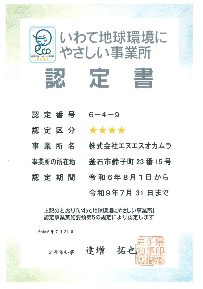 当社の二酸化炭素排出抑制への取り組みが評価され、4つ星の「いわて地球環境にやさしい事業所」に認定されました。釜石市で4つ星認定は当社のみです。