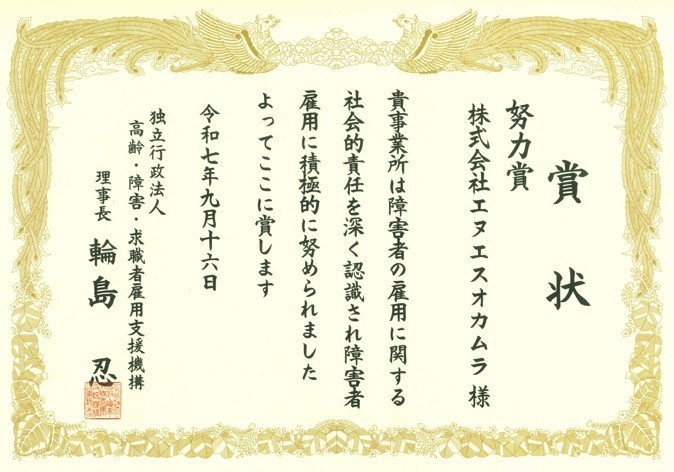 令和7年度(独)高齢・障害・求職者雇用支援機構理事長努力賞を受賞!!